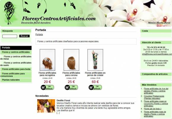 Mónica Diseño Floral ha salido a Internet con su proyecto en www.floresycentrosartificiales.com realizado por INPQ, donde se pueden comprar flores artificiales a través de un solo click. Flores artificiales para fiestas, eventos, bodas, comuniones, así como centros artificiales y plantas artificiales para cualquier espacio a decorar. La gestión del sitio Web permite al administrador un control total sobre la herramienta, manejando tanto el catálogo como las noticias como las páginas estáticas desde ahí. Las fichas de producto poseen todo detalle sobre los artículos, con fotografías hechas por la propia empresa y que son ampliables para ver de una mejor forma los productos. Ya se puden comprar flores artificiales por Internet de una forma segura en www.floresycentrosartificiales.com