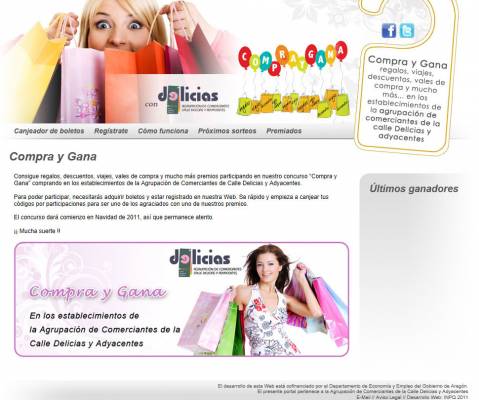 INPQ vuelve con la creación de concursos, esta vez en una de las calles con más prestigio de Zaragoza, la calle Delicias, con su nuevo concurso Compra y Gana en http://compraygana.calledelicias.com Compra y Gana es muy sencillo, y es que solamente es necesario realizar compras para poder conseguir regalos. Cada 15⬠de compra el comprador recibirá un boleto con un código único y particular hasta un máximo de 20 boletos. Una vez disponga de este boleto el cliente, solamente tendrá que acceder a la Web, registrarse si no lo ha hecho todavía, e inscribir su boleto en la base de datos, para tener una oportunidad de ganar un regalo en los sorteos que periódicamente se vayan realizando. El sistema así mismo avisará de los próximos sorteos a realizarse así como de los premiados que haya en cada sorteo realizado, para que éstos vayan a buscar su regalo. Así que ya lo sabes, si vives en Zaragoza o pasas por Zaragoza, ves a la calle Delicias y compra que seguro ganas. Compra y Gana, en http://compraygana.calledelicias.com