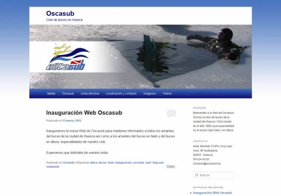 Oscasub ya disponen de un espacio Web donde dar a conocer a través de Internet este club de buceo de la ciudad de Huesca, especialistas en buceo en hielo y en altura, un proyecto realizado por INPQ utilizando WordPress. A través del dominio www.oscasub.es se podrán ir viendo las novedades que en el club se vayan realizando, las cuales se irán introduciendo como noticias, así como poder ver para aquellos que desconozcan Oscasub, quiénes son, dónde se encuentran o fotos y videos de las actividades realizadas, tanto en Huesca, como fuera de España. Gracias a WordPress todo el sitio Web es 2.0 disponiendo en el mismo una suscripción a RSS para cualquier lector de Feeds, así como la posibilidad de que los visitantes puedan dejar sus comentarios en todas y cada una de las noticias que se introduzcan en la Web. Ahora ya todo el mundo podrá saber que para bucear no hace falta tener mar, y que además se puede hacer en Huesca. www.oscasub.es