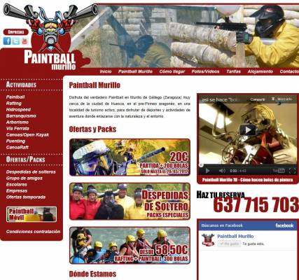 Paintball Murillo en Murillo de Gállego (Huesca – Zaragoza) renovó el aspecto de su portal Web, confiando nuevamente en INPQ para esta tarea, y llenando su nuevo portal en www.paintballmurillo.com de nuevos contenidos con los que informar con claridad a sus clientes. La nueva Web nada más acceder se puede comprobar su moderno aspecto, con una portada donde se incluye un video así como imágenes con las ofertas o el acceso a las redes sociales o ver a través de un mapa donde se encuentra el Paintball. La distribución de las secciones se realiza en 3 grandes grupos distribuidos de la siguiente forma: El primero en la parte superior con un menú horizontal donde están las secciones básicas, con la empresa, el cómo llegar con videos explicativos y un mapa de google, las fotos y videos del Paintball, las tarifas, los alojamientos y un completo formulario de contacto. En el segundo grupo, ya en el menú izquierdo encontramos las actividades que se pueden realizar, paintball, rafting, hidrospeed, barranquismo, arborismo, vía ferrata, canoas, open kayak, puenting o canoaraft, todas ellas con la información necesaria y fotografías ampliables. Por último, el tercer grupo aglutina los packs para despedidas de soltero, grupos de amigos, escolares o empresas, además de las ofertas de temporada, el Paintball móvil y las condiciones de contratación, todo ello con imágenes ampliables y texto informativo. Además de ello la Web dispone de accesos directos a sus espacios en las redes sociales de Facebook, Twitter y Youtube, donde se encuentra y seguirá encontrando información. El Paintball Murillo ya tiene un nuevo aspecto, y se encuentra en www.paintballmurillo.com