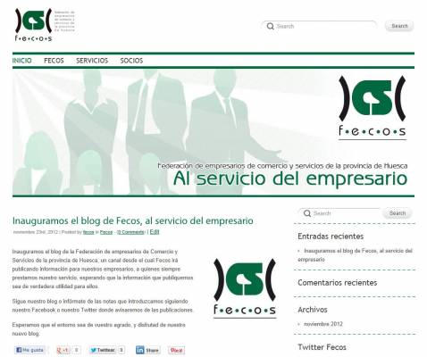 La Federación de Empresarios de Comercio y Servicios de la provincia de Huesca estrenan un nuevo espacio en Internet para mantener informadas a las empresas que componen dicha federación, siguiendo así al servicio de la empresa. Gracias al dominio www.empresarioshuesca.com se podrán ir viendo todas las noticias, notas e informaciones que desde Fecos se quieran trasladar al empresario, a través de un diseño limpio y que invita a leer. Gracias a WordPress todo el sitio Web es 2.0 disponiendo en el mismo una suscripción a RSS para cualquier lector de Feeds, así como la posibilidad de que los visitantes puedan dejar sus comentarios en todas y cada una de las noticias que se introduzcan. Fecos ya tiene su espacio en Internet para informar a sus empresarios. www.empresarioshuesca.com