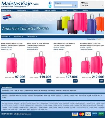 Maletas Viaje tras unos años con el mismo formato ha optado por renovar su comercio electrónico en www.maletasviaje.com dando de esta forma un aspecto más actual a la venta de maletas a través de Internet. El comercio electrónico sigue conservando la totalidad de las herramientas que hasta ahora disponía, mostrándolas de otra forma y agregando alguna funcionalidad nueva que se puede ver tanto en los listados de los productos donde la imagen gana importancia, así como en la ficha de producto donde la información se encuentra dividida por pestañas. El administrador del comercio electrónico sigue controlando la totalidad del mismo, con una flexibilidad total dado que se han ampliado las zonas a mantener, modificando los datos e información que quiera, pudiendo mantener menús, añadir pluggins y banners, así como creando y borrando cualquier dato. Los artículos siguen enseñando una completa información con fichas muy detalladas, ya que se muestran todos los datos de interés referentes a cada uno de los productos, y con fotografías de calidad donde se puede ver tanto la principal como el resto de fotografías en la misma zona, todas ellas ampliables para no perder ningún detalle. Tu sitio en Internet para comprar tu maleta para viajar sigue estando en el mismo lugar de siempre: www.maletasviaje.com