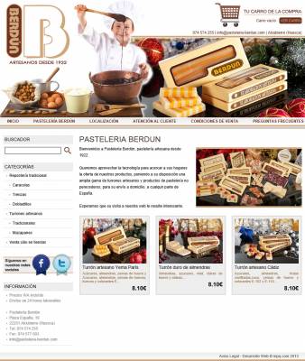 Pastelería Berdún sale a la luz en Internet con su nuevo comercio electrónico en www.pasteleria-berdun.com donde ofrece online su repostería y turrones artesanos que lleva elaborando desde 1922, siendo una de las pastelerías más emblemáticas de la provincia de Huesca. Con un aspecto fresco y diáfano se puede observar una cabecera que constantemente cambia gracias a un carrusel con sus productos, para ya adentrarnos en una tienda virtual distribuida por categorías, para llegar finalmente a una completa ficha de producto, donde ponemos encontrar además de la descripción, nombre y fotografía ampliable del producto, otra serie de campos tabulados donde encontrar los ingredientes o si los productos son aptos para celiacos. También encontraremos otra serie de productos que a modo de catálogo se muestran pero no se venden, como tartas o pasteles, debido a las dificultades del transporte. Una vez realizada la selección de productos, el usuario podrá pagar los mismos a través de tarjeta, transferencia bancaria o contra reembolso, llegando a su domicilio el producto sin perder la calidad de los ingredientes en ningún momento. Si quieres una pastelería artesana con muchos años de prestigio, que pueda elaborar la repostería y turrones que deseas para Navidad o el resto del año, tu sitio está en Pastelería Berdún, en www.pasteleria-berdun.com