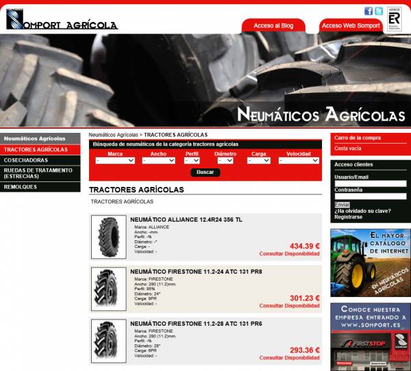 Nuevo comercio electrónico de venta de neumáticos agrícolas en www.neumaticosagricolas.com, realizado para Neumáticos Somport, y destinado a la venta de neumáticos, cubiertas, ruedas… de tractor, cosechadora, maquinaria o remolque. El mayor catálogo en Internet de neumáticos agrícolas, perfectos para el campo y la agricultura, se encuentra distribuido por categorías, desde las cuales se puede acceder a los artículos. Dentro de las categorías se puede realizar un filtro de artículos por marca, ancho, perfil, diámetro, carga y velocidad, para dar con el neumático requerido. La ficha del neumático consta de la descripción del mismo, así como de una fotografía ampliable, con la posibilidad de comprar el producto y pagarlo online. Si buscas buenas gomas para tu vehículo en el campo, este es tu sitio: www.neumaticosagricolas.com