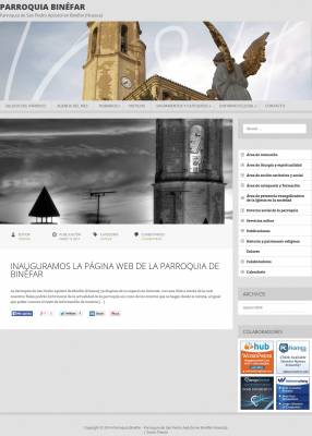La Parroquia de San Pedro Apóstol en Binéfar (Huesca) ya disfruta de su nuevo espacio en Internet en www.parroquiabinefar.com donde informar a los fieles y visitantes de la Web de la actualidad y actividad o eventos que desde la parroquia se realizan, así como conocer la propia parroquia. El desarrollo se ha hecho con WordPress, y bajo una plantilla básica se albergan multitud de páginas informativas acerca de la parroquia, así como el blog donde ir actualizando lo sucedido en la parroquia, al igual que un menú superior y uno derecho y una cabecera dinámica con un carrusel de fotografías. Mucha información y una parroquia más que se une a Internet, uno de los medios más importantes de información y que desde luego no pueden dejar de lado, tal y como se ve. Ya lo sabes, todo lo que necesites saber de la Parroquia de Binéfar, ya tiene su sitio en Internet: www.parroquiabinefar.com